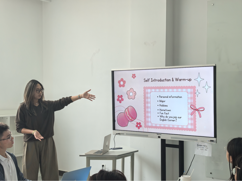 英语服务志愿者协会会长李一林主持。主持人请大家以简单的自我介绍进行热场,拉开了此次沙龙的序幕。同学们依次向大家介绍自己。现场欢声笑语,活动氛围轻松愉快,拉近了彼此的距离。